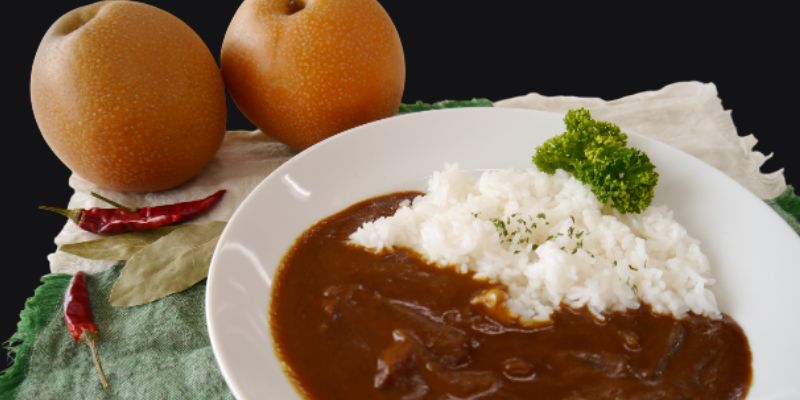 三重県明和町特産の「松阪牛」と、明和町特産品の「梨」を使用しました。同じ明和町という名前をもつ三重県明和町とは、友好交流提携を結んでいるため夢のようなコラボレーションをすることができました。